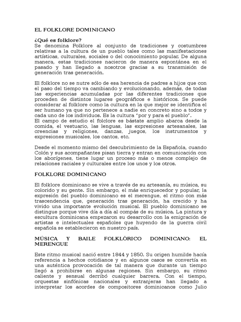 Folklore dominicano página 2 folklore dominicano. Es una pieza de origen española se practica en la ciudad de baní donde la población de origen negro celebran el solsticio de verano y cual coincide con el día de san juan bautista. Estas incluyen tradiciones orales como cuentos leyendas proverbios chistes música tradicional. De origen ingles folk traducido al español significa pueblo y lore saber. De enciclopedia dominicana sos. Sin embargo el más enriquecedor y popular la expresión del pueblo dominicano es el merengue el ritmo con más trascendencia que generación tras generación ha crecido y ha vivido una importante evolución musical.
